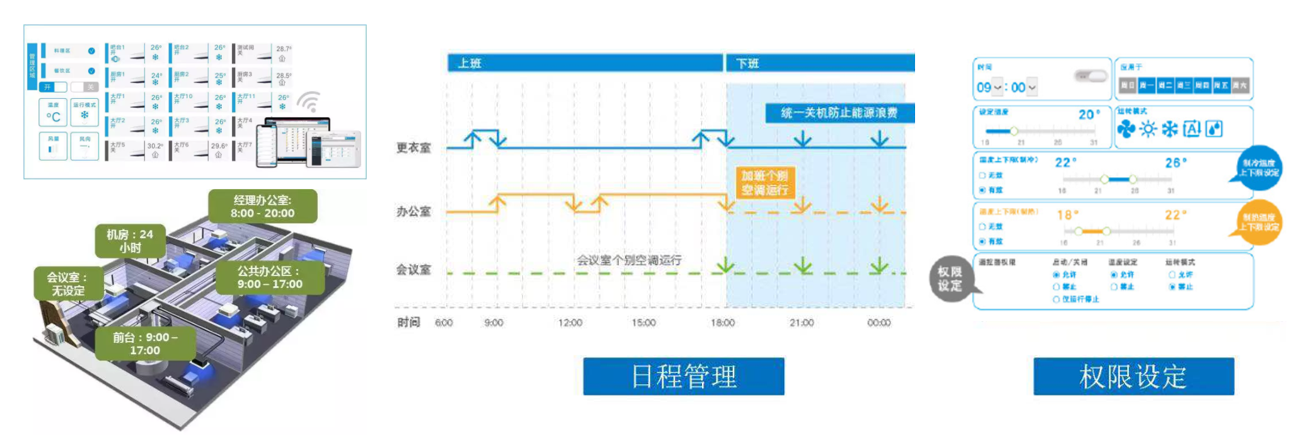 根據日常使用情況可對空調進行日程設定,避免每日手動開關的繁瑣工作,更能有效減免空調忘關造成的能源浪費。而權限設定既可保持靈活的溫度調節性,又能防止無關人員隨意調控空調的情況。