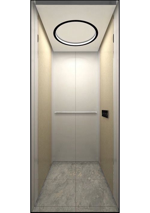 天井:噴砂不銹鋼  后側(cè):彩紋鋼板浮雕木紋+鏡面不銹鋼  左右:彩紋鋼板浮雕木紋+彩紋鋼板大理石紋+鏡面飾條  前側(cè)+轎門:香檳金鏡面  地板:PVC大理石紋