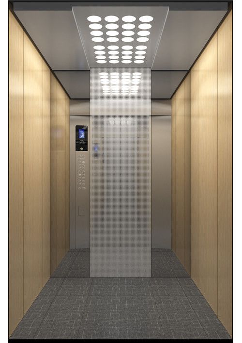 轎廂型號:YG-1625  天井:鉆石銀噴涂鋼板(YG-11)  兩側、后側板:兩側杉木紋彩紋鋼板(KB-02)+鏡面不銹鋼飾條+深咖色砂紋烤漆板(YG-08)  前側板、門楣:緞紋不銹鋼  轎門:緞紋不銹鋼  地板:FL-P31(砂巖米黃PVC)  操作盤:BC-D2F2