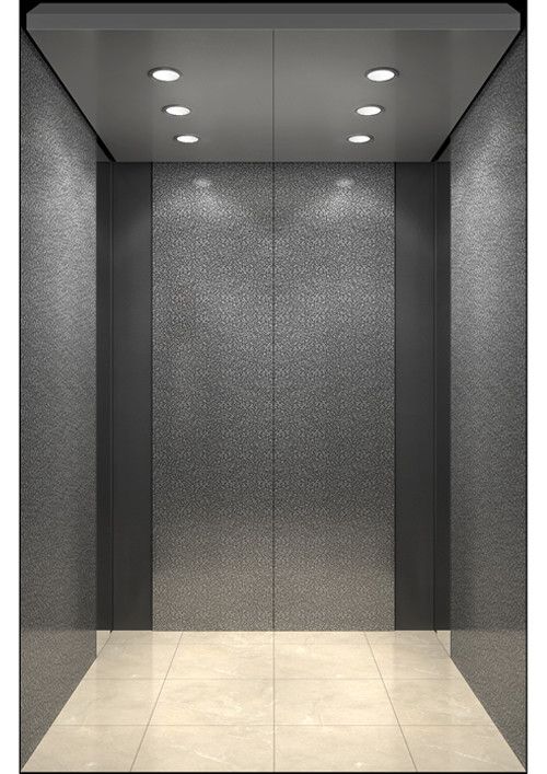 轎廂型號:YG-1623  天井:香檳砂紋板(YG-07)  兩側、后側板:兩側灰色砂紋噴涂鋼板(YG-01)+鏡面不銹鋼,后側麥點布紋彩紋鋼板(HK-03)+鏡面飾條  前側板、門楣:緞紋不銹鋼  轎門:緞紋不銹鋼  地板:FL-P32  操作盤:BD-D2F1