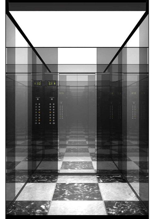 轎廂型號:YT-4690  天井:SKY-PU,軟膜天井  兩側、后側板:中間片鏡面不銹鋼,其余鏡面鍍黑鈦  前側板、門楣:鏡面不銹鋼鍍黑鈦  轎門:鏡面不銹鋼鍍黑鈦  地板:大理石拼花(FL-M14)  操作盤(一體式):BC-P5DT2