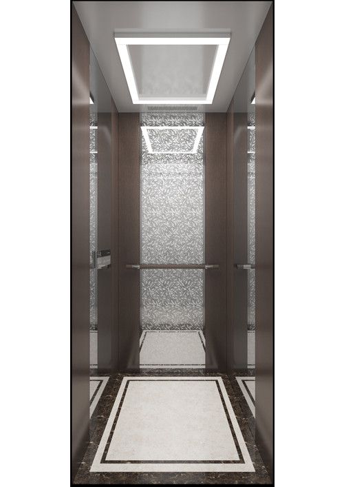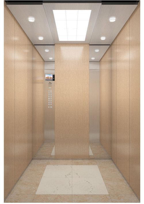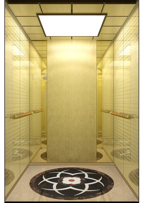 天井:噴砂不銹鋼  后側:彩紋鋼板浮雕木紋+鏡面不銹鋼  左右:彩紋鋼板浮雕木紋+彩紋鋼板大理石紋+鏡面飾條  前側+轎門:香檳金鏡面  地板:PVC大理石紋