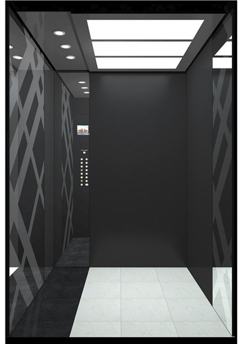 轎廂款型:YG-1643  天井:鏡面不銹鋼  兩側、后側板:兩側鏡面不銹鋼+黑鈦褪色花紋鏡面不銹鋼,后側黑色砂紋板(YG-02)+鏡面不銹鋼  前側板、門楣:鏡面不銹鋼  轎門:鏡面不銹鋼  地板:FL-PH11(拼花PVC)  操作盤(一體式):顯示屏:云端傳媒,其它:同BC-P5DT2