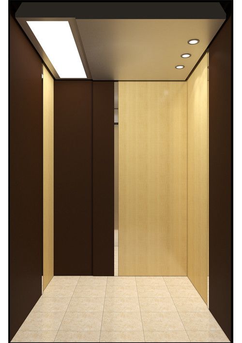 轎廂型號:YG-1625  天井:鉆石銀噴涂鋼板(YG-11)  兩側、后側板:兩側杉木紋彩紋鋼板(KB-02)+鏡面不銹鋼飾條+深咖色砂紋烤漆板(YG-08)  前側板、門楣:緞紋不銹鋼  轎門:緞紋不銹鋼  地板:FL-P31(砂巖米黃PVC)  操作盤:BC-D2F2