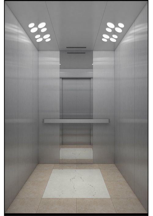 轎廂型號:YG-1623  天井:香檳砂紋板(YG-07)  兩側、后側板:兩側灰色砂紋噴涂鋼板(YG-01)+鏡面不銹鋼,后側麥點布紋彩紋鋼板(HK-03)+鏡面飾條  前側板、門楣:緞紋不銹鋼  轎門:緞紋不銹鋼  地板:FL-P32  操作盤:BD-D2F1