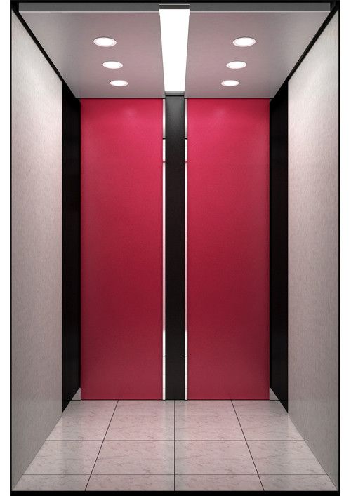 轎廂型號:YG-1624  天井:鉆石銀噴涂鋼板(YG-11)  兩側、后側板:兩側黑色砂紋板(YG-02)+彩紋鋼板(HK-02),后側紅色砂紋板(YG-03)+黑色砂紋板(YG-02)+彩紋鋼板(HK-02)  前側板、門楣:緞紋不銹鋼  轎門:緞紋不銹鋼  地板:FL-P40(白色PVC)  操作盤:BD-D2F1