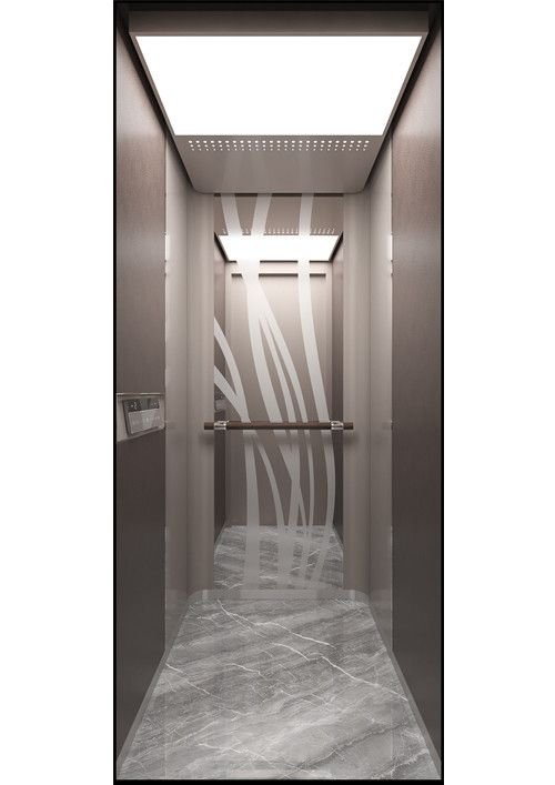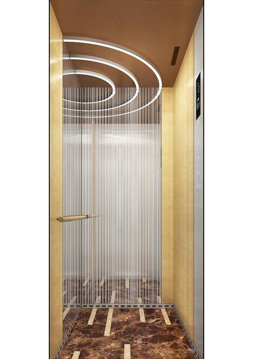 轎廂型號:YG-1622  天井:白色砂紋噴漆板(YG-05)+鏡面不銹鋼  兩側、后側板:兩側香檳色砂紋鋼板(YG-07),后側香檳色砂紋鋼板(YG-07)+深咖色砂紋烤漆板(YG-08)+鏡面飾條  前側板、門楣:緞紋不銹鋼  轎門:緞紋不銹鋼  地板:FL-P34(米黃PVC)  操作盤:BD-D2F1