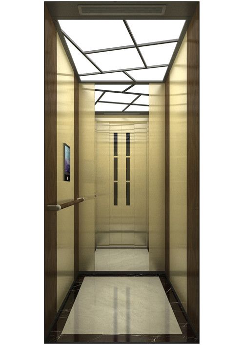 天井YLH-WY,黑色亞光鋁合金框架  前側板抗指紋香檳金噴砂不銹鋼  門楣抗指紋香檳金噴砂不銹鋼  兩側彩紋鋼板(KB25)+抗指紋香檳金噴砂不銹鋼  后側板抗指紋香檳金噴砂不銹鋼+鏡面不銹鋼  轎門抗指紋香檳金噴砂不銹鋼  操作盤BC-T8A1  扶手深色木質直線型(MS-91)  踢腳板黑色PVC  地板大理石(云多拉灰+黑白根)