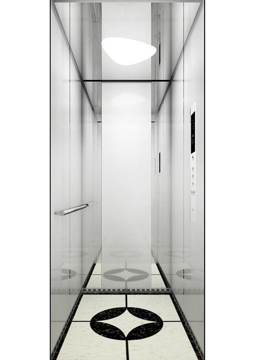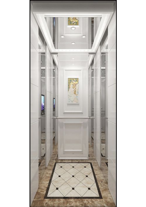 轎廂款型:香榭麗舍  天井ECO-XL,木飾框(亮白)+鏡面不銹鋼  前側板鏡面不銹鋼  門楣鏡面不銹鋼  兩側木飾面(亮白)+鏡面不銹鋼  后側板木飾面(亮白)+鏡面不銹鋼+裝飾畫(選配)  轎門鏡面不銹鋼  操作盤BC-T8A1  扶手皮紋(銀白)+鏡面不銹鋼  地板大理石拼花(西班牙米黃+金鑲玉+水晶啡)