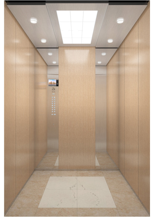 天井:ECO-MY;發紋不銹鋼+鋼板烤漆(BN-10)  前側板、門楣:發紋不銹鋼  兩側:彩紋鋼板(KB19)+發紋不銹鋼+鏡面飾條  后側板:彩紋鋼板(KB19)+鏡面不銹鋼  轎門:發紋不銹鋼  操作盤:BC-D2F2  地板:PVC拼花(FL-PH25)